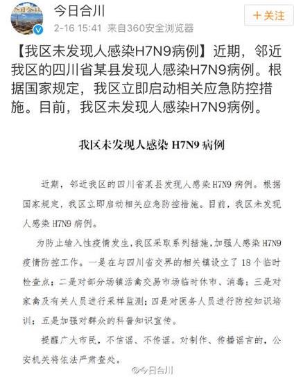 近期,邻近重庆合川区的四川省某县发现人感染H7N9病例。16日,合川区委宣传部官方微博@今日合川 发布通报称,根据国家规定,合川区立即启动相关应急防控措施。目前,合川区未发现人感染H7N9病例。