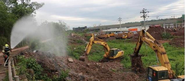 发现这一情况后,周边群众拨打了119报警,消防官兵到达现场后看到土石堆里不时冒出阵阵白烟,方圆百米内都能闻到一股刺鼻子辣眼睛的气味。为了排查事故原因,将影响尽可能地减少,消防人员一边用水对发生泄露的地点进行稀释,一边拉起现场警戒,疏散围观人员,同时禁止一切火源。
