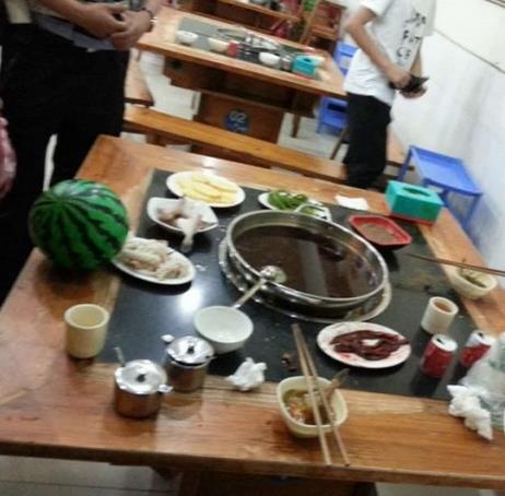 杨女士说,傍晚她和几个好友来到这家餐馆。上菜后,杨女士和好友们正在聊天,刚动了筷子不久,突然一个东西从杨女士头顶飞过,落入了滚烫的火锅中。