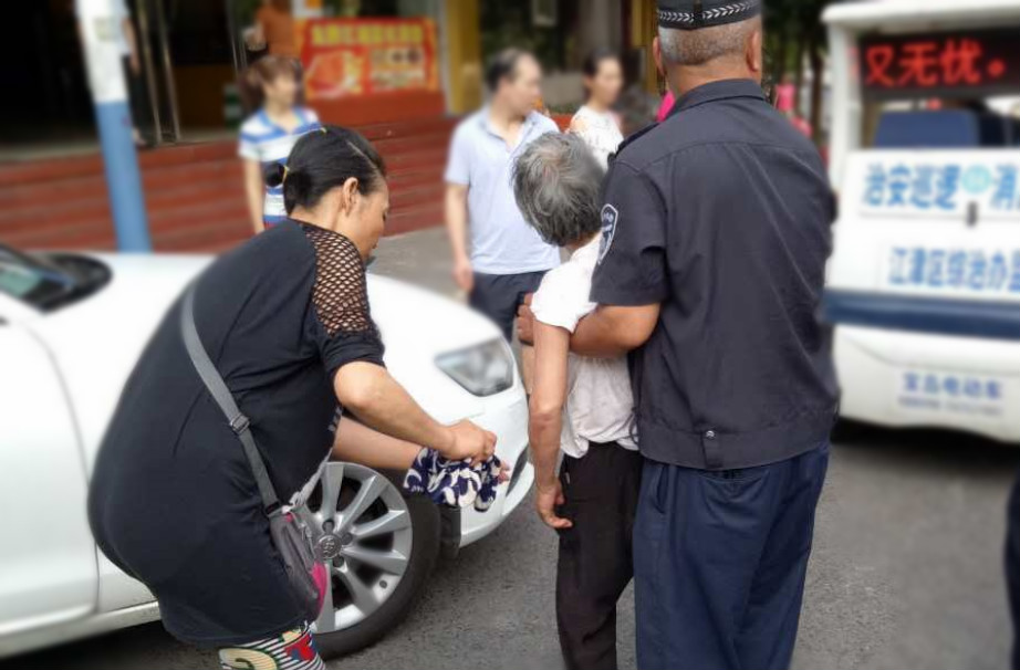 治安巡逻的老张看到了,从车上跳了下来。询问围观群众当时的情况,有人说:“你看嘛,那个老婆婆说倒就倒,躺在那个车子旁边了,都不晓得是怎么回事!”