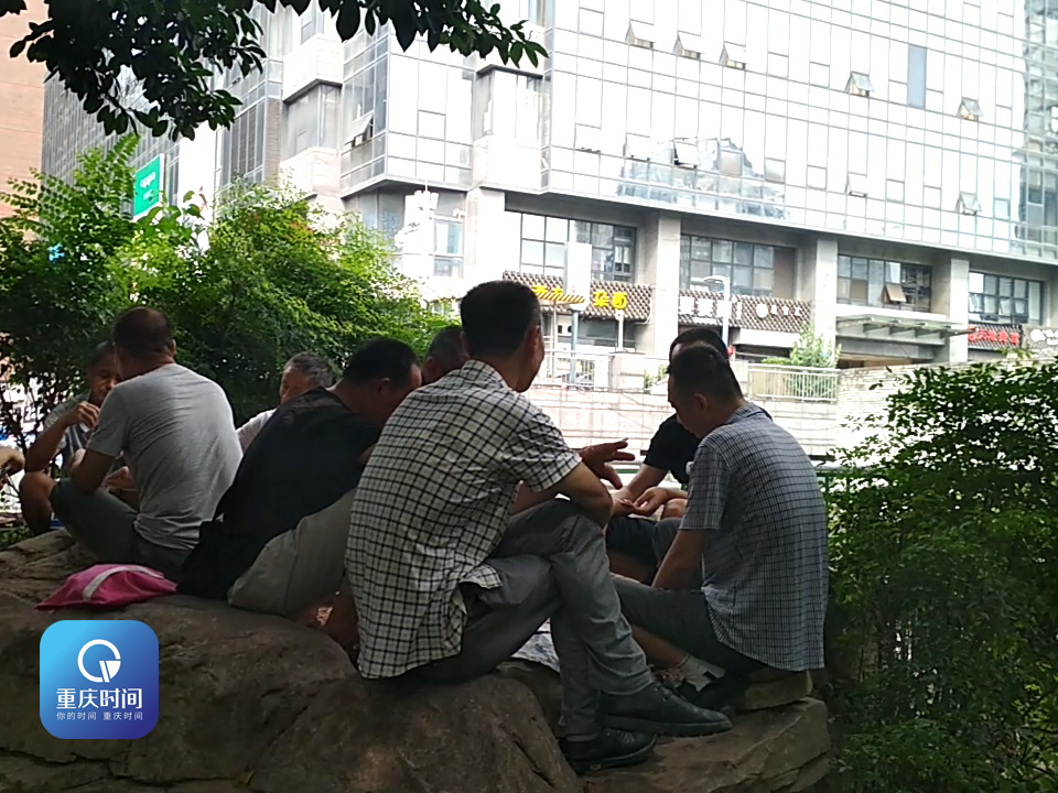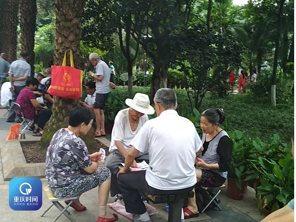 在观音桥商圈内,有一条道全是摆着打扑克的,打扑克的人不仅有大爷还有大妈,他们在树子底下摆上自带的小桌子和小板凳。