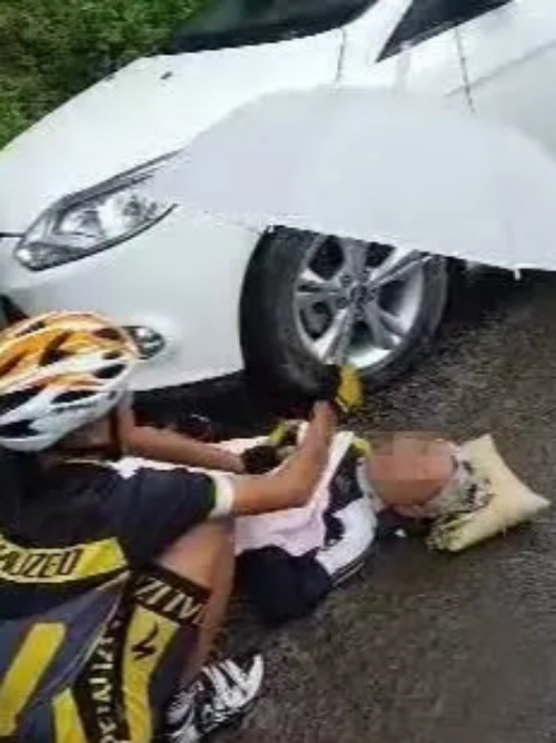 此次事故导致一人受伤,从现场图片来看,当时正在下雨,一自行车车主躺在地上,头下垫着一个枕头,另一位骑手为他撑着伞。