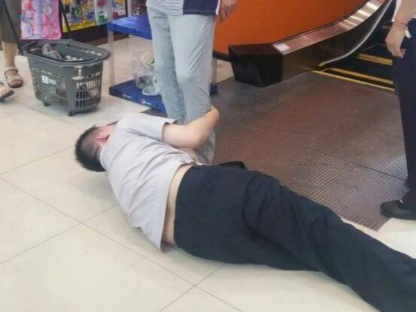 因为一个碎鸡蛋 保安躺在地上紧紧抱住顾客大腿