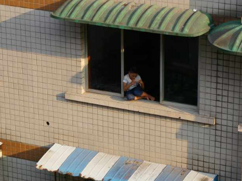 张先生来到男孩所在居民楼的楼下,询问坐在外面聊天的居民,那是谁家的熊孩子?一个人坐在窗台玩手机,很危险!
