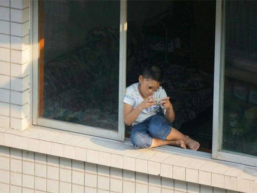 一名身穿白t恤,蓝色牛仔短裤,约六七岁的小男孩盘着双脚坐在没有防护栏的窗台上,男孩双手紧紧的握着手机,身体还不时晃动,头部低着,感觉眼睛都要触到屏幕上一样。