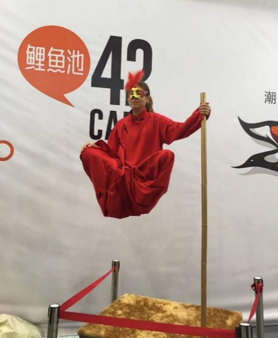 发布时间:2017-09-18 09:41:51上周末,秦女士和家人一起到重庆国博中心举办的文博会上逛了一圈。在其中一个展台,吸引了不少市民驻足观看,秦女士好奇地上前查看发现,一名女子半遮面,一身红色的服饰,双腿盘旋在空中,镇定自若。