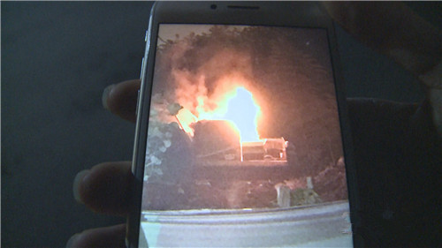 由于挖掘机停靠在隧道洞口的上方,消防车无法抵达现场,消防队员只能通过连接消防水带的方式进行灭火。
