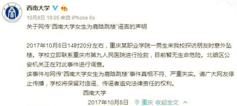 西南大学回应“女学生为鹿晗跳楼”:一男生意外坠楼