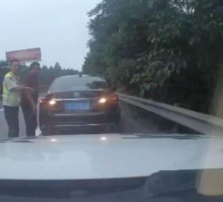 10月10日16时许,高速执法二支一大队执法人员在沪蓉高速垫江段巡逻时,发现前方一辆黑色轿车开着双闪,在行车道上以不超过30KM/H的速度行驶,执法人员立即拉响警笛,引导驾驶人将车停在应急停车带内。