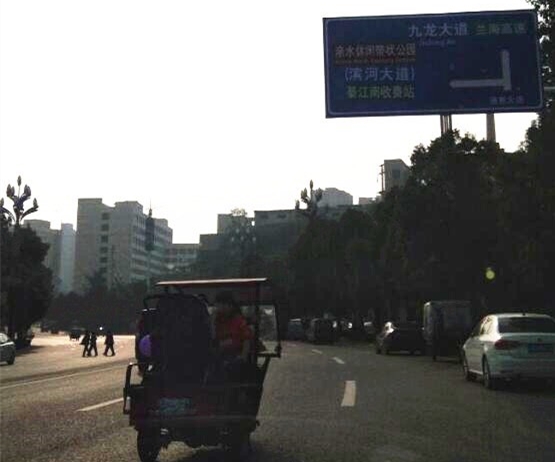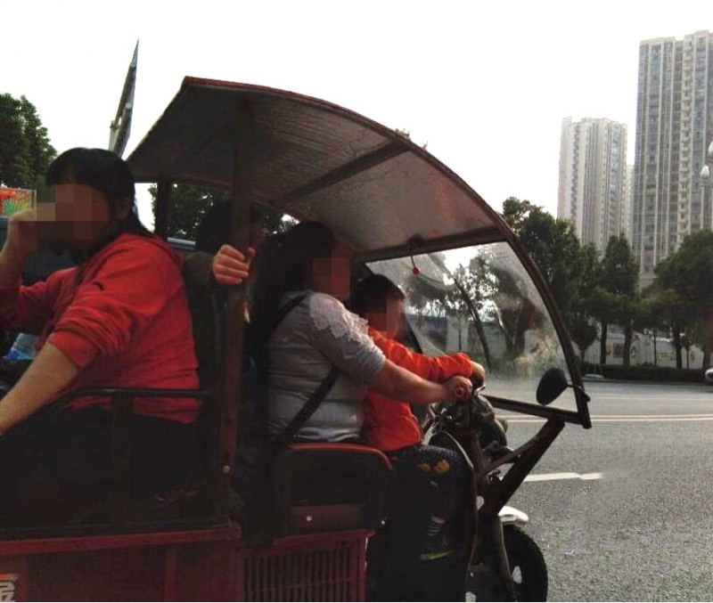 女司机把三轮车开出了商务轿车范 载大人小孩共7人路上飞奔