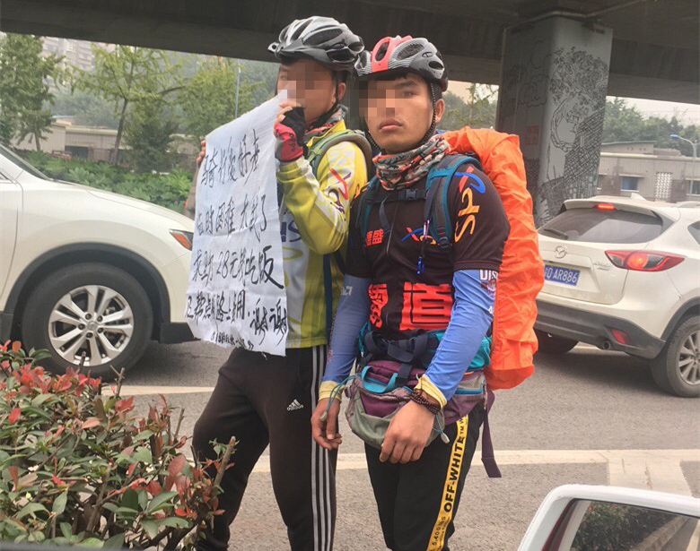 驴友手中举着牌子,向来往车辆和过往的人群寻求帮助,上面写着“骑行落难请求帮助,买饭吃及一些资金备用”等文字。