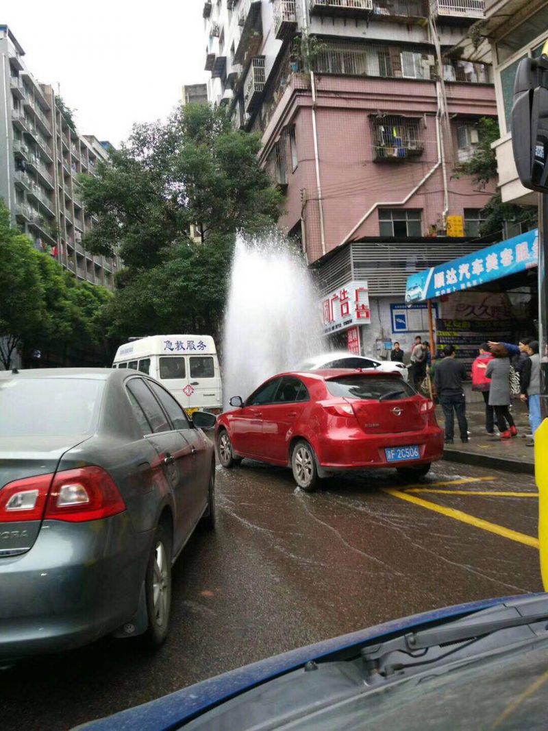 相撞后轿车又冲到了旁边梯坎上,把路边的消防栓撞坏,导致水流顺着马路一直流到北滨大道上。