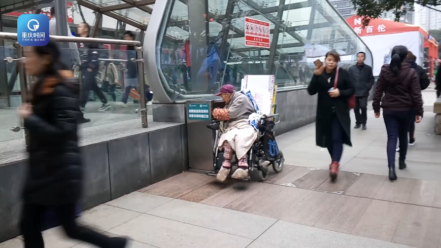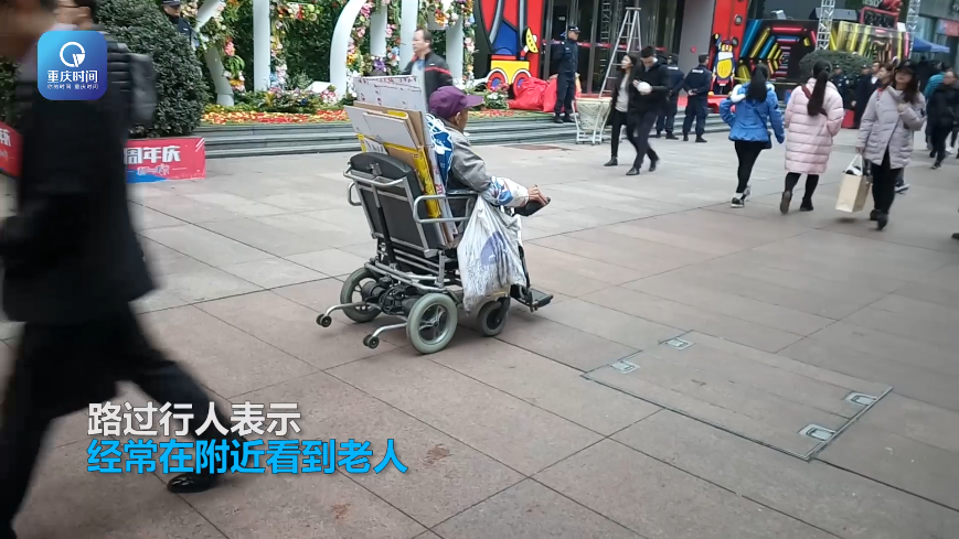 发布时间:2017-11-27 16:36:412017年11月24日,重庆市江北区观音桥步行街,有市民看到一位坐着电动轮椅的老人正在翻拣垃圾箱,轮椅上放着刚刚拾得的纸板塑料瓶。