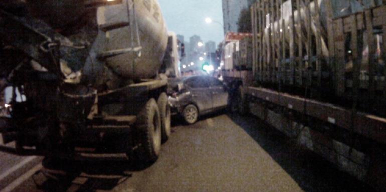 到达现场后,民警发现,双向两车道的道路右侧,一辆小型轿车被两辆大型车夹在中间,受损严重,所幸无人受伤。