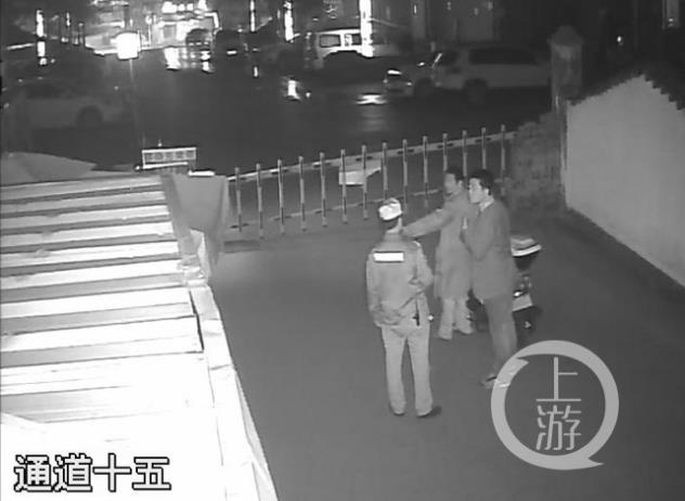 半个小时后,肖某看到两名男子出来了。“年纪大点的那个男的,推了一辆两轮白色踏板摩托车。一般车主不会推着车走,我觉得有点可疑。”肖某上前盘问男子为何不骑车,年长的男子称忘了带钥匙,并对肖某“多管闲事”骂骂咧咧,另一个年轻点的男子则主动来到值班室进行登记。