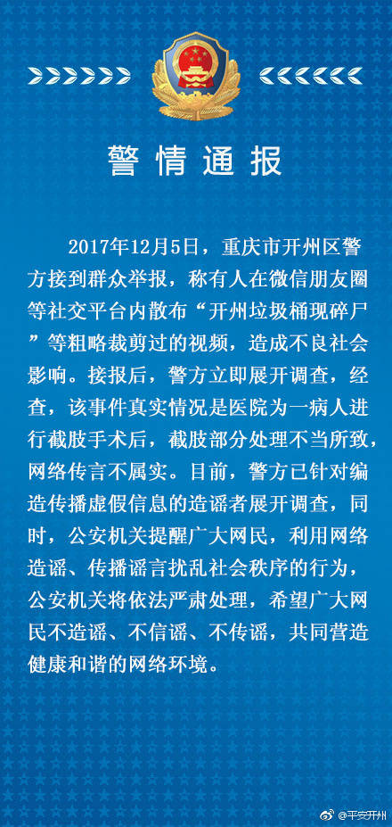开州警方辟谣:“开州垃圾桶现碎尸”实为谣言