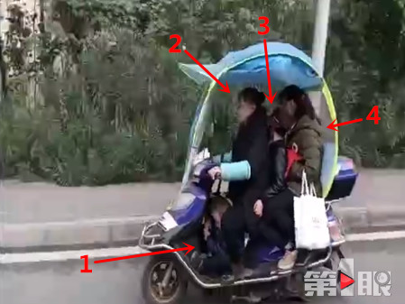 2轮电动车搭载4人 脚踏板蜷缩着幼童