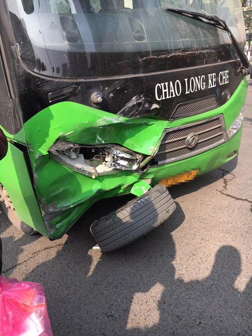 蓝色小车的后轮胎被撞掉,直接卡在了大客车车头,看着十分尴尬。车身完全变形,损毁严重接近报废。