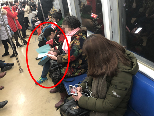 霸气!小学生翘着二郎腿 在车厢内奋笔疾书