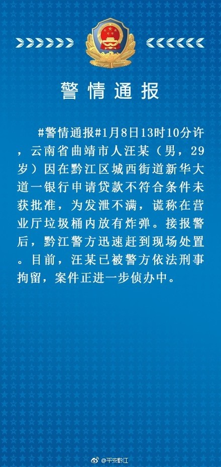 1月8日晚, @平安黔江微博发布警情通报称:1月8日13时10分许,云南省曲靖市人汪某(男,29岁)因在黔江区城西街道新华大道一银行申请贷款不符合条件未获批准,为发泄不满,谎称在营业厅垃圾桶内放有炸弹。接报警后,黔江警方迅速赶到现场处置。目前,汪某已被警方依法刑事拘留,案件正进一步侦办中。