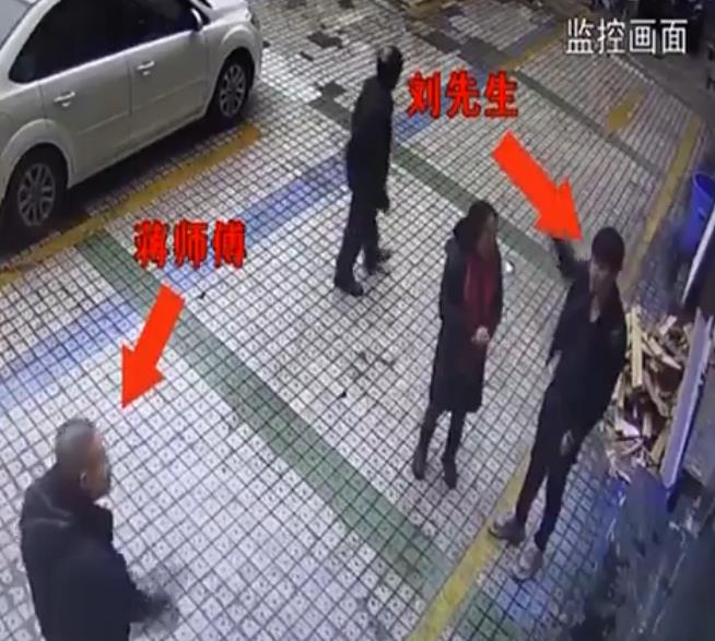监控画面显示,当时,蒋师傅和刘先生在停车场里情绪十分激动,发生口角。随后,保安蒋师傅用手指着刘先生不停靠近,刘先生对着蒋师傅一拳挥过去。