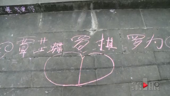 在香国公园这条上山的步道上,记者看到,每一级台阶上都用粉笔写着“老婆我爱你”几个大字,放眼望去,十分壮观。