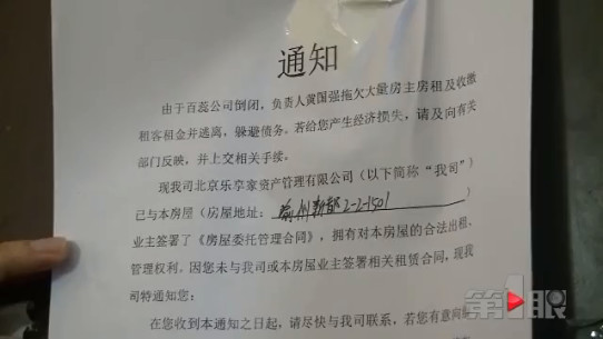然而,就在两天前,她意外发现门上贴了一张通知,表示之前租房给她的“百蕊公司”倒闭了,房东把房子又委托给了另外一个公司管理,而新公司不承担前公司的任何债权债务,目前要求像小常这样的租客,要么重新交钱、签合同续租,要么搬家走人。