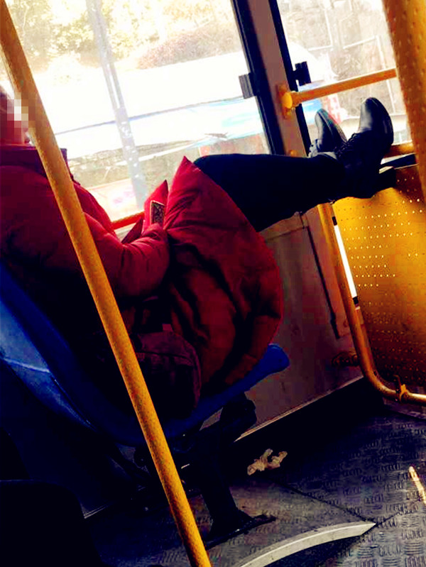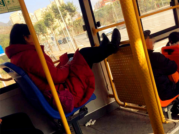 女子乘公交坐姿霸气 双脚搭在护栏上玩手机