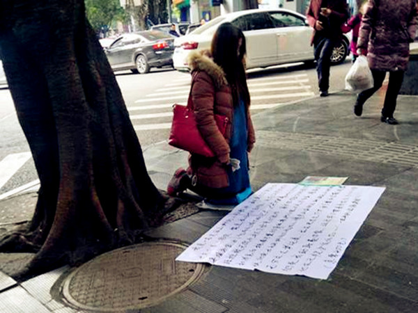“她说得自己很可怜,也有不少路人同情她,但我已经看到不少路人在给钱了,几十块几块都有人给,她手里捏着钱在那里跪着,我们都觉得她可能是骗子”在附近工作的人如是说。