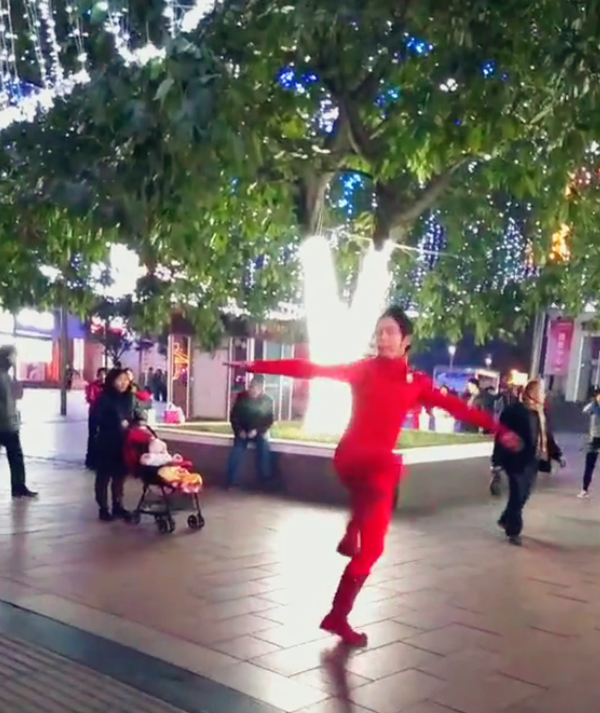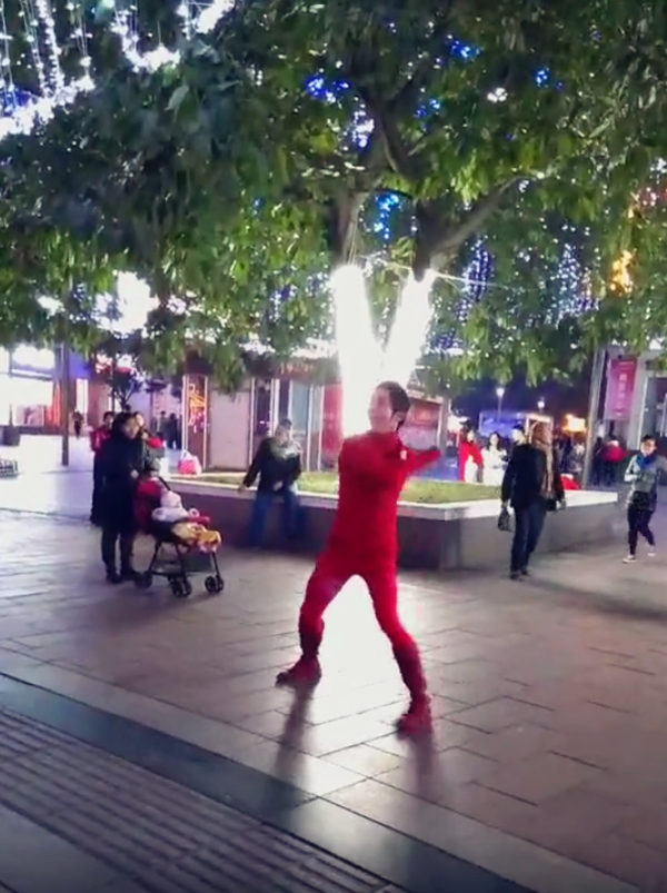 红衣男子热舞引围观 街头坝坝舞黯然失色