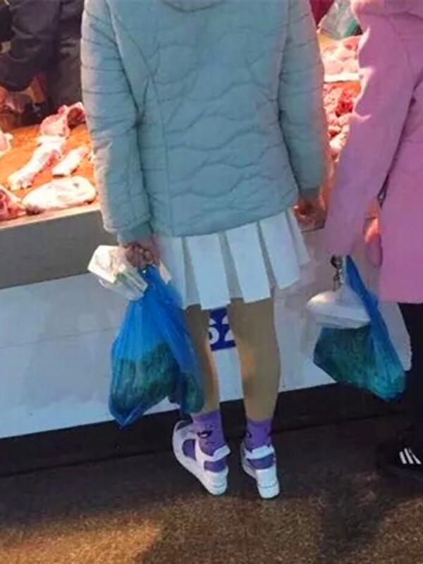 这名女子看上去,很年轻,大约20岁左右,她身穿着厚厚的浅蓝色棉衣,下身穿着清新可爱的白色迷你短裙,脚上穿着凉鞋并搭配紫色的袜子,引人注目。手里还拿着自己刚买的一些菜,与旁边买菜人的衣着形成极大的反差。