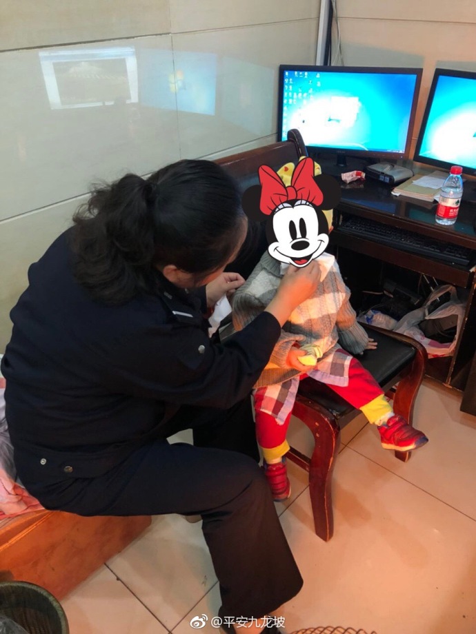 来自平安九龙坡官微的消息:4月5日晚19点,金凤派出所民警叶旻和刘明亮净慈寺村巡逻时捡到一名3岁左右的小女孩,在询问周边村民后,大家都称没有见过,为了方便照顾孩子并尽快找寻孩子父母,民警立即将小宝抱回派出所。