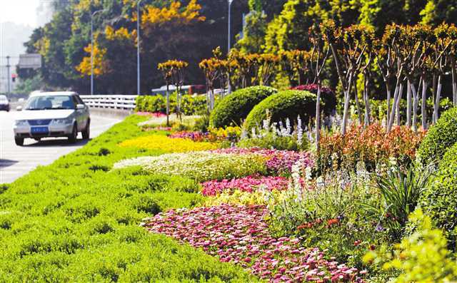 来自重庆日报的消息:近日,在渝中区重庆长江大桥北桥头,提升后的绿化景观。近段时间,江北、渝中、南岸等区的多条主干道繁花似锦,五彩缤纷。为进一步提升城市园林绿化品质,自今年2月下旬以来,市城管委结合“增绿添园”开展园林绿化提升方面的5类重点整治工作,让重庆的“颜值”再升级,市民四季都能看花赏景。
