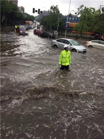 暴雨致街头积水 执勤辅警冒雨站水中当路标