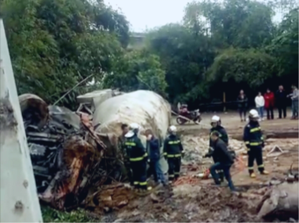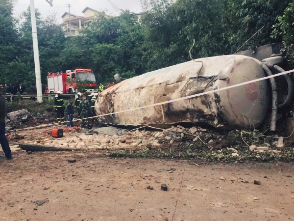 罐车失控侧翻进泥泞坝子 首尾瞬间分离
