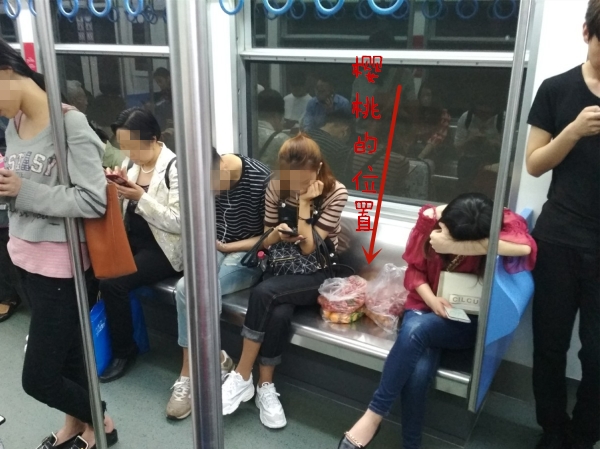 2018年4月12日中午快2点时候,有市民正好乘坐在轨道交通3号线的一节车厢里,在靠近电屏门的一节座位上,两袋樱桃刚好占了1个座位。