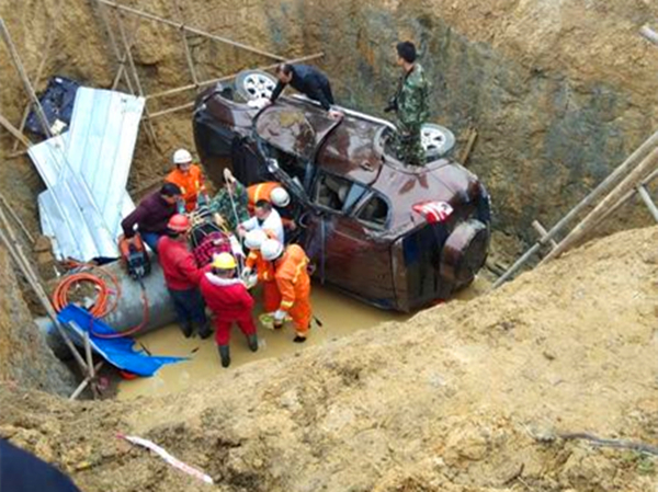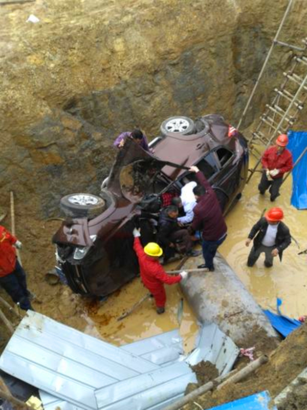 私家车冲破钢棚掉进深坑 满身泥泞起不来