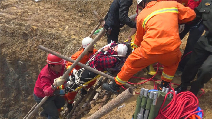 一名消防员下到坑底部侦查情况,为救援制定措施。