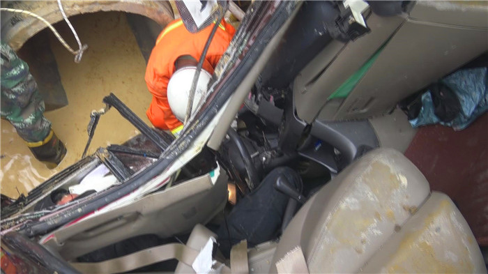 消防员看到,由于坑深约2米,汽车坠入后,驾驶室严重变形,车头面目全非,驾驶室空间狭小,没有可支撑救援器材的合适位置,指挥员立即决定,首先用破拆工具对重卡车头进行破拆。