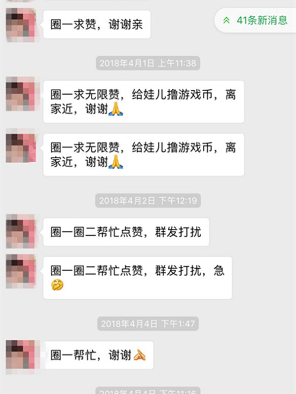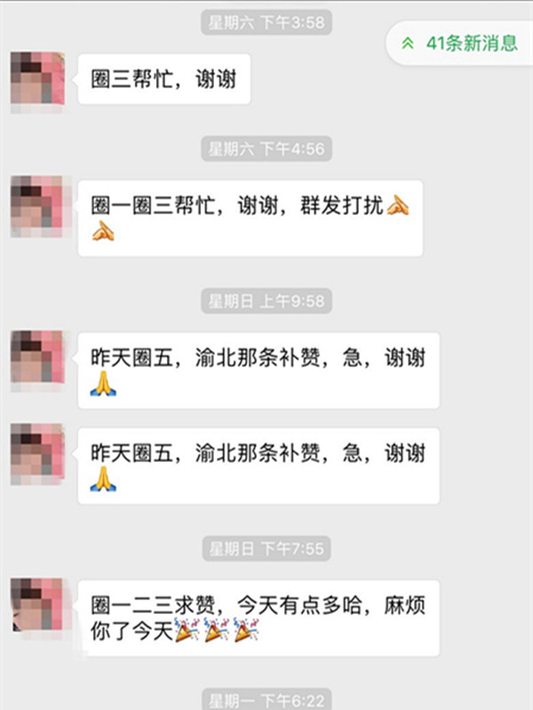 2018年4月17日,有网友爆料,最近遇到了这样的事,有朋友一直群发点赞的事,现在自己犹豫要不要拉黑她这位朋友。据爆料网友介绍,因为工作关系加的好友,最开始每天都会发消息帮她点赞,自己也礼貌地帮忙点一下。可现在,一打开手机全是几条点赞的信息,要么是给孩子点赞,要么是给景区点赞,看到这些信息,简直让人受不了,爆料网友抱怨道。
