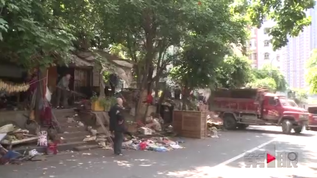 十几年来,这片棚区的垃圾越堆越多,已经成为了当地最为突出的环境卫生问题。从4月15号开始,鱼洞街道广益街社区动用了大量工人和车辆,对这片违法搭建的棚区进行拆除,把堆积在此的大量垃圾进行了清运。工作人员介绍,15号和16号两天,他们已经基本完成了违建区域的拆除,运走了二三十车垃圾。七十多岁的周婆婆,是这片违建区域的主人。前两天的整治过程中,周婆婆表现得十分配合。可到了第三天,她似乎有些情绪,睡在了门前的人行道上,老人的儿子王先生也坐在地上,搀扶着神志不太清醒的母亲,还时不时用纸巾为她擦擦脸。