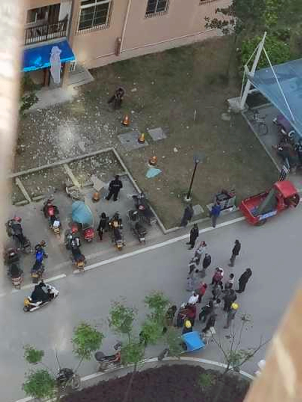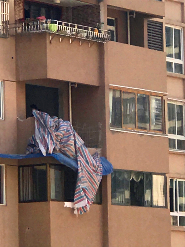阳台外面本来是被一层塑料膜围住,可打砖块的时候,不慎将塑料膜击破,大量碎石坠落。通过现场图片可以看到,地面上满是落下来的碎石块,一片狼藉。