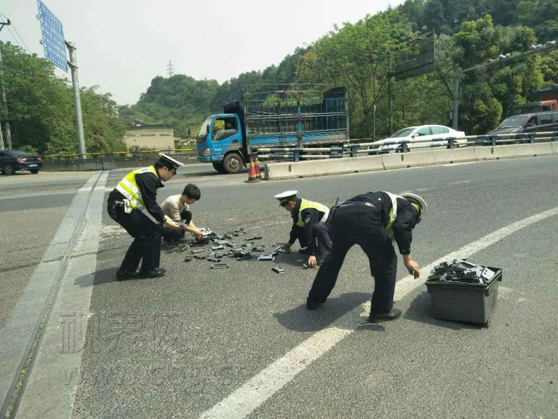 看着满地配件和过往车辆,驾驶员王某不知如何是好,手足无措。为避免配件受损,民警急忙疏导过往车辆一边避开绕行,一边和驾驶员一起捡拾散落在地的零件。在交巡警的紧急援助下,配件很快被捡完装箱。民警又让王某将车移至路边不影响交通地方重新固定装货,直到消除安全隐患后,才允许王某继续驾驶货车上路。