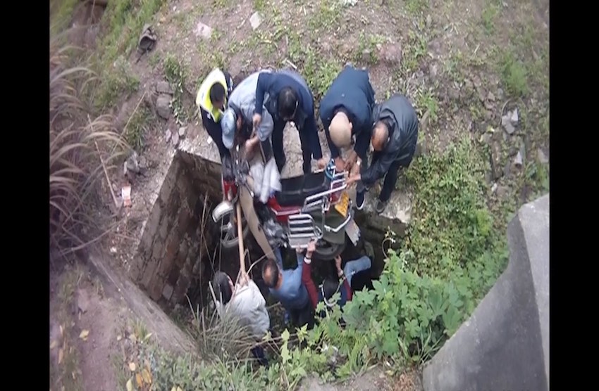来自实况新闻—重庆时报的消息:4月16日早上7点左右,在巴南区百节加油站附近,一辆摩托车径直冲下了路边一个5米高的堡坎,所幸的是,摩托车驾驶员在摩托车冲下去的那一刻及时跳了车,否则后果不堪设想。