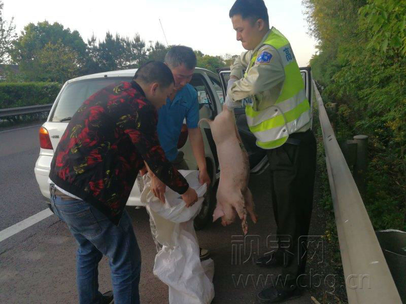 当天下午6点过4分,执法人员巡逻至事发路段附近时发现了一头猪,它正趟在超车道旁边的路肩上喘大气,随时可能起身行走给过往车辆正常通行带来隐患。执法人员随即将执法车停在后方应急车道,打开警报器对过往车辆鸣笛警示,并迅速将其拖移至应急车道旁的高速护栏外,及时消除了交通安全隐患。