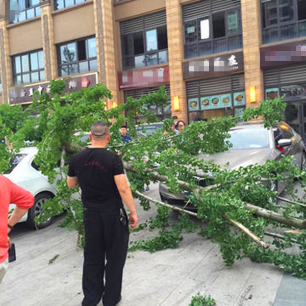 2018年4月19日下午,重庆街头刮起大风呼呼作响,有网友爆料称,在重庆璧山南门一餐馆门口,一颗绿油油的树,横倒在了两辆私家车的头顶上,将其盖住,整个车顶都“绿了”。