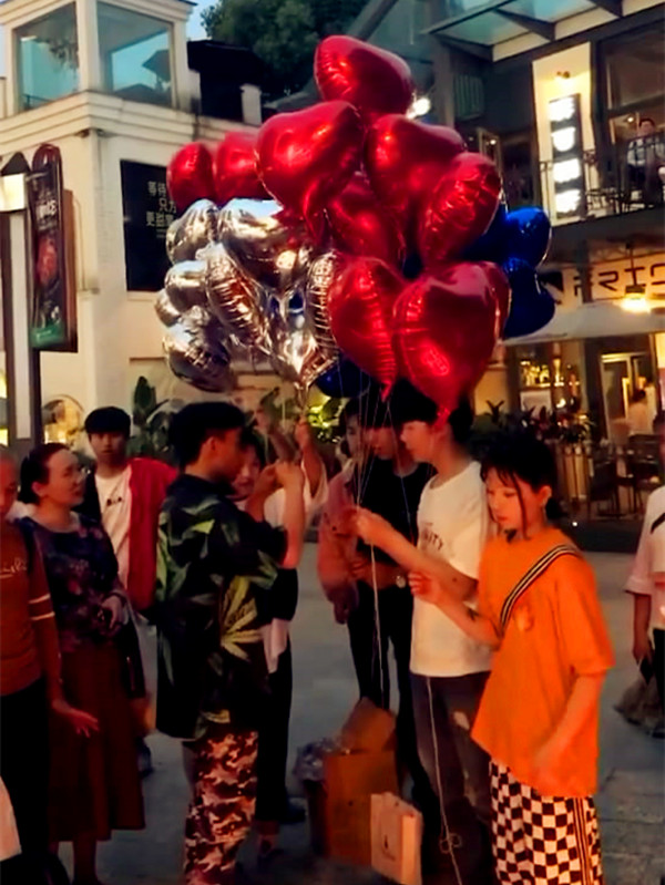 只见广场上围满了路人,女主约着朋友们,拿着各种颜色的爱心氢气球以及彩灯气球,现场温馨浪漫非常梦幻。