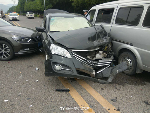 来自平安九龙坡官微的消息:5月14日上午,一辆黑色轿车司机胡某在二郎新区大道一双实线处掉头,但此时对向车道有另一辆黑色轿车正在正常行驶,当胡某准备减速让行时,后方一辆面包车因未保持安全车距,刹车距离不够,撞上胡某驾驶的轿车,而胡某也被两车挤成了夹心饼干。