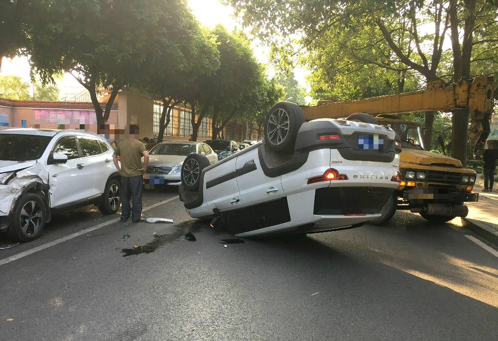 据现场目击者介绍,当时白色SUV突然撞向停靠在路边的车辆后,摔得个四脚朝天。所幸的是,事故并无人员伤亡。