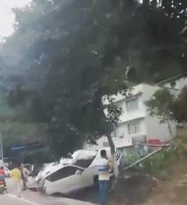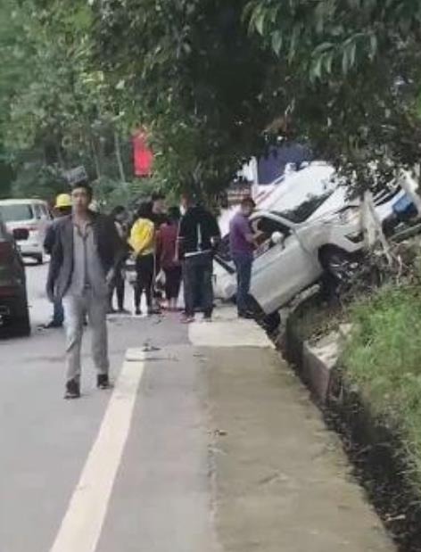 白色越野车撞坏了设置在道路一侧的栏杆,顺势倒下的栏杆压在了绿油油的植物上。